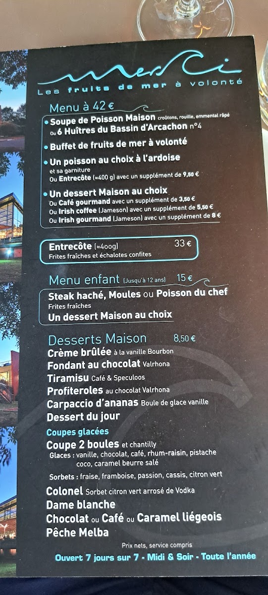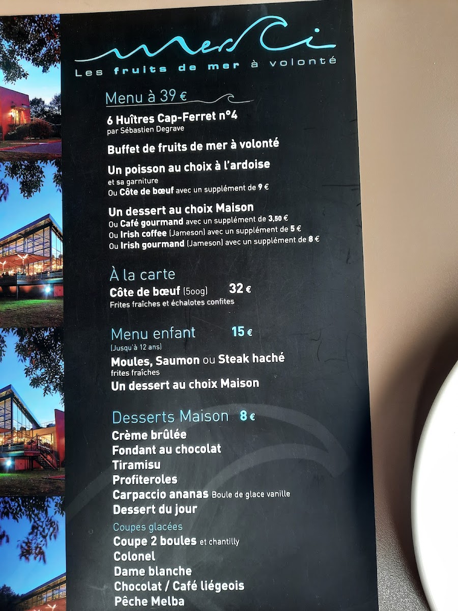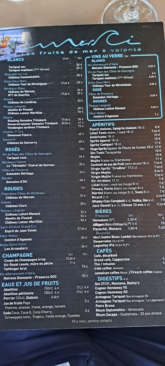 Introducing the menu at Merci - PORT GARONNE, located beautifully at 8 Rue de la Capitainerie in Begles, France, is an experience not to be missed. This delightful restaurant, praised for its excellent seafood, offers a vibrant atmosphere that complements its culinary offerings. Customers rave about the stunning views and the inviting terrace, perfect for enjoying your meal while basking in the sun.